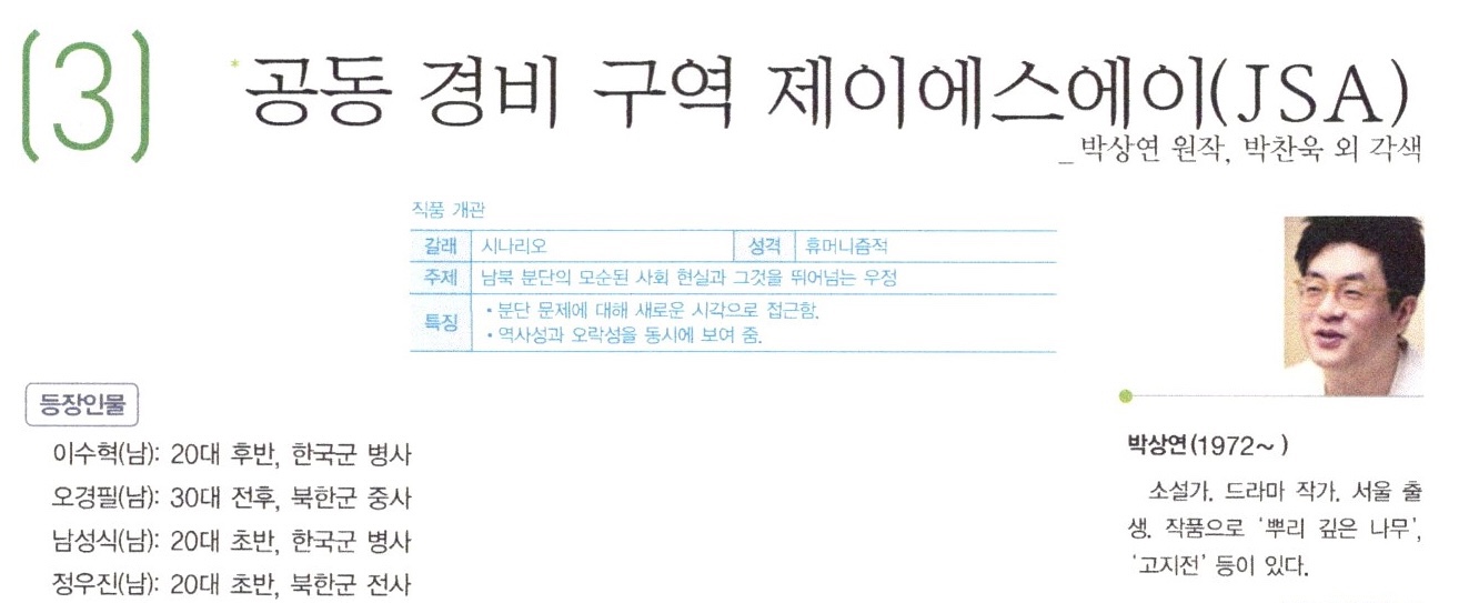 박상연의 소설 DMZ는 판문점 북측 초소에서 일어난 살인 사건과 사건 조사를 책임진 중립국 장교의 가족사가 다뤄진 소설이다. 공동경비구역 JSA는 이 소설을 원작으로 영화감독이자 시나리오 작가인 박찬욱이 제작한 영화다. 이 두 작품은 판문점 북쪽에서 벌어진 남한 병사에 의한 북한 병사 총기 난사 사건을 수사하는 과정의 이야기를 일종의 추리 기법으로 전개해 나가는 내용을 각기 다른 장르로 형상화하였다. 작품의 공간적 배경은 판문점 공동 경비 구역으로 북한군과 남한군이 서로 마주 보며 대치 상태에 있는 곳이다. 공동 경비 구역에서 남한군과 북한군이 서로 대치하고 있다는 것은 민족적 비극의 상징이다. 이러한 상황 속에서 지뢰를 밟아 위기에 처한 수혁을 인민군 병사인 경필과 우진이 도와줌으로써 서로 간에 우정이 싹트게 된다. 하지만 현실은 이들이 남과 북으로 갈려 서로 대치할 수밖에 없는 상황이다. 따라서 여기에 등장하는 인물들은 외면적으로는 남한과 북한군으로 대치하고는 있으나 내면적으로는 인간적 우정을 나누고 있다는 점에서 외적 상황과 내적 상황 간의 갈등을 겪고 있다. 이것은 민족적 비극이 우리가 원해서 이루어진 것이 아님을 상징하는 동시에 이념적 갈등이 휴머니즘에 의해 얼마든지 극복될 수 있다는 것을 보여준다. 작품의 서술자 역할을 담당하는 소령은 중립국 소속 한국계 스위스인이라는 점과 인민군 출신 장교의 딸 등의 신분적 특징을 함께 갖는다. 중립국 소속이라는 신분은 객관적으로 사건을 관찰할 수 있게 해 준다. 이것은 작품 내에서 서술자와 인물을 구분함으로써 각 인물들이 가진 다양한 주관적 시선을 동시에 받아들일 수 있게 하고 작품 밖에서는 기존의 고정된 사회적 규율을 벗어나 새로운 시각으로 분단을 바라보게 하는 장점이 된다.
