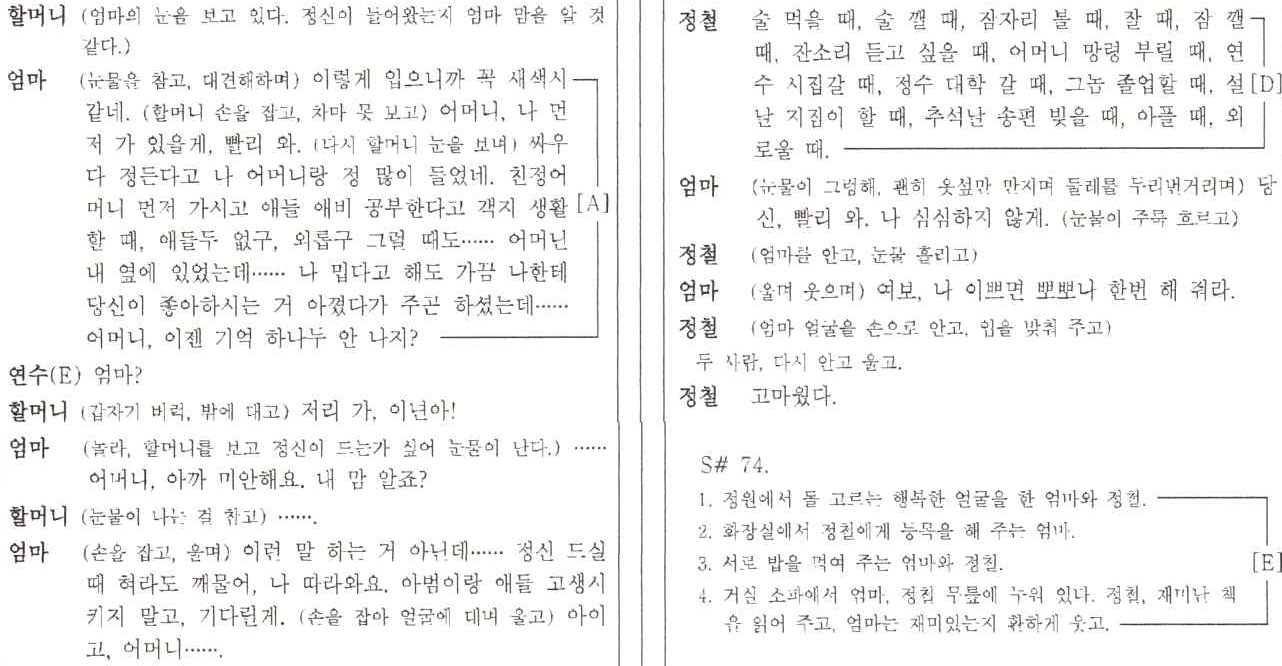 시나리오 : <정철 - 술 먹을 때, 술 깰 때, 잠자리 볼 때, 잘 때, 잠 깰 때, 잔소리 듣고 싶을 때, 어머니 망령 부릴 때, 연수 시집갈 때, 정수 대학 갈 때, 그놈 졸업할 때, 설날 지짐이 할 때, 추석날 송편 빚을 때, 아플 때, 외로울 때.> <인희 - 당신 빨리 와. 나 심심하지 않게.(눈물이 주룩 흐르고)